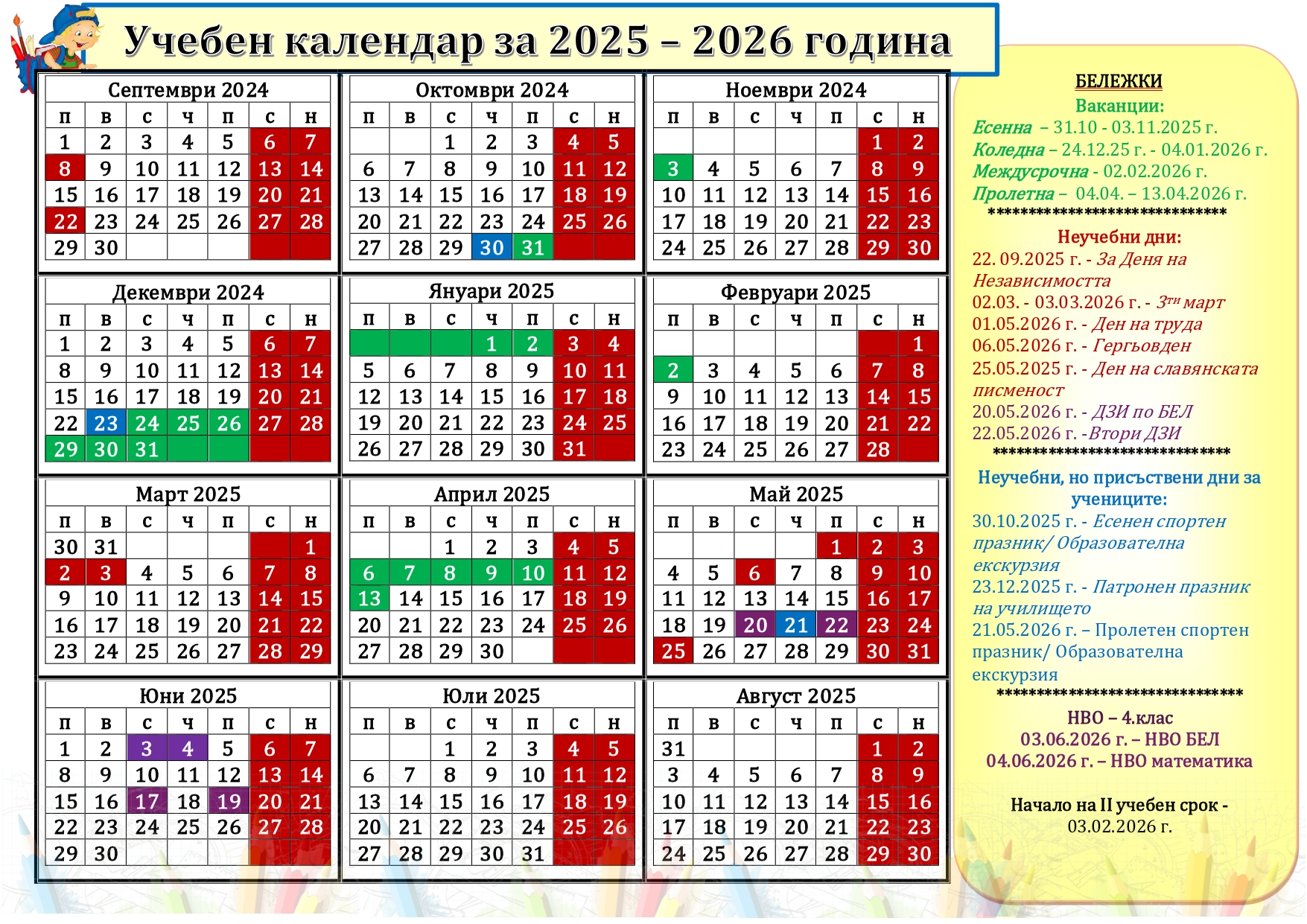 ВАКАНЦИИ И НЕУЧЕБНИ ДНИ ЗА УЧЕБНАТА 2025/2026 ГОДИНА
